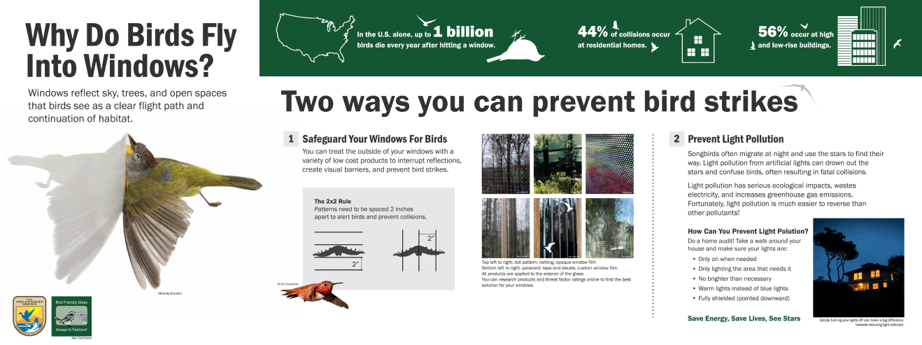 Since 1970, there are 3 billion fewer birds worldwide. Glass collisions are the second-leading human-related cause for bird loss today.¹ The annual loss of birds due to glass collisions is at a minimum of 1.28 billion and as high as over 5 billion birds in the U.S.A., with potentially billions more worldwide.² This is because birds cannot perceive glass and often mistake it for surrounding habitat reflected on the exterior window surface or attempt to fly through glass barriers to reach habitat that can be seen on the other side.