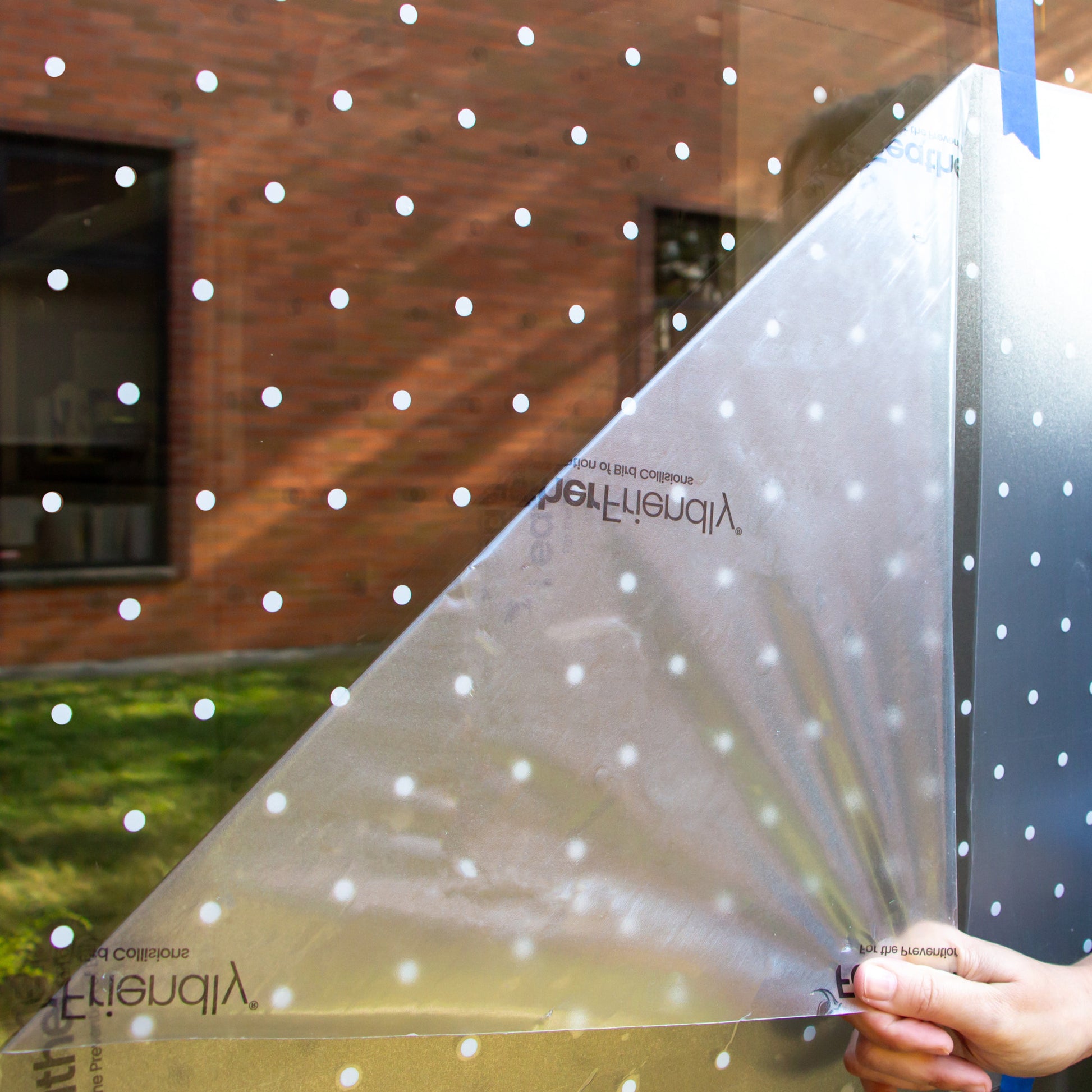 Transparent or semi-transparent glass is considered fly-through because birds see greenery and/or sky on the other side without realizing that there is a barrier preventing them from reaching it. Bus shelters, clear railings, and walkways between buildings are just some examples of fly-through glass. Fly-through glass must be treated with a high-contrast hue, like our black markers, which stand out against the light shades of the sky and clouds.